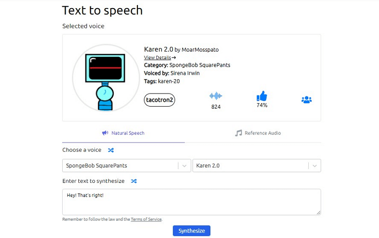 FakeYou, which used to be called Vocodes, is an online tool that offers more than 2300 different voices including SpongeBob’s voice. You can start by picking a category, subcategory, and the type of voice that you want to have from the filtered ‘Voice’ list. Next, you can type your text and click ‘Speak’ to listen to how the generated voice sounds.